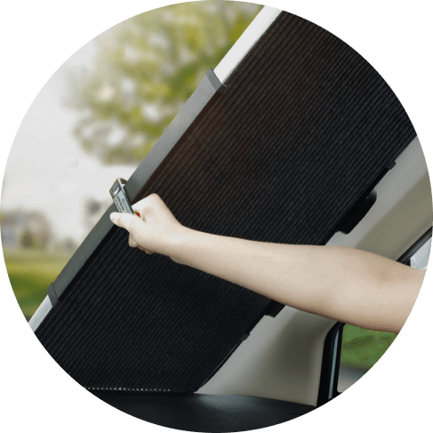 When you’ve parked your car and are ready to go, pull the tab of the sunshield to expand it. Lock the sunshield in by latching the end hook onto a suction cup.