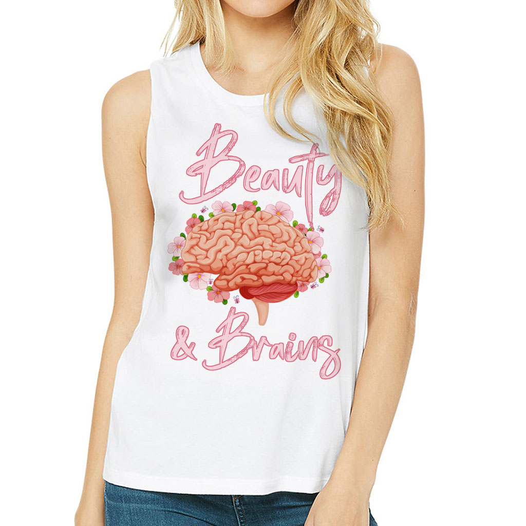 Beauty and Brains Women’s Muscle Tank is made from high-quality materials. The soft fabric fits perfectly to the body and suits any type of figure. Our products will make your everyday comfortable, as well as add charm to your image and emphasize your style.