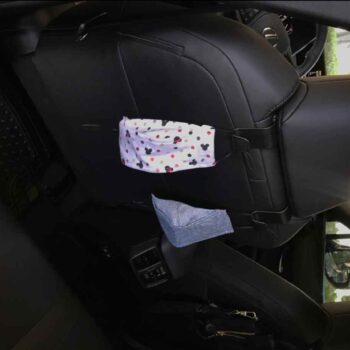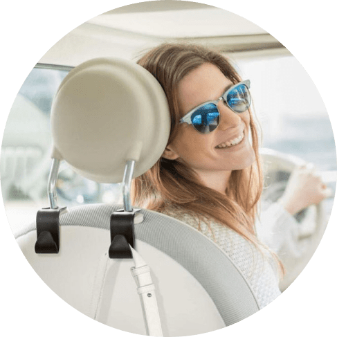 Our little hook clips attach to any headrest’s poles and support up to 44 pounds.