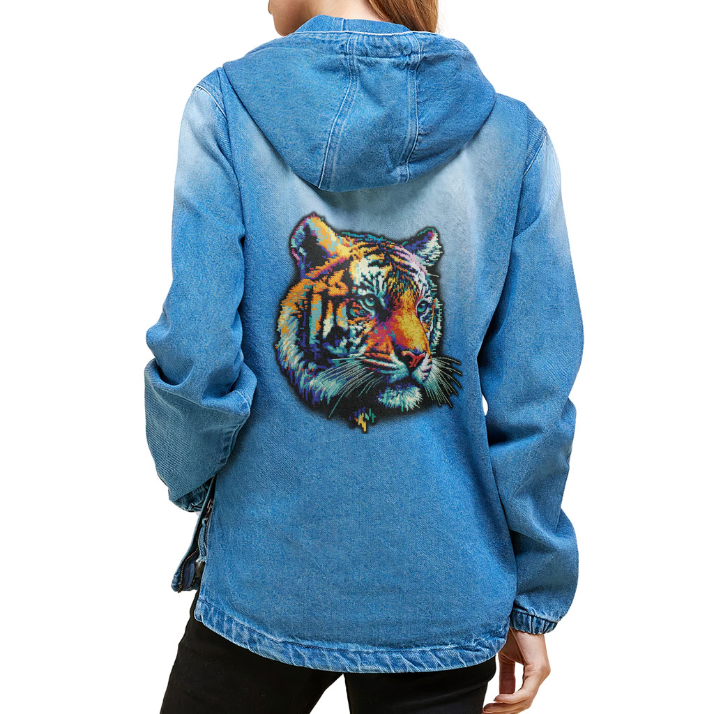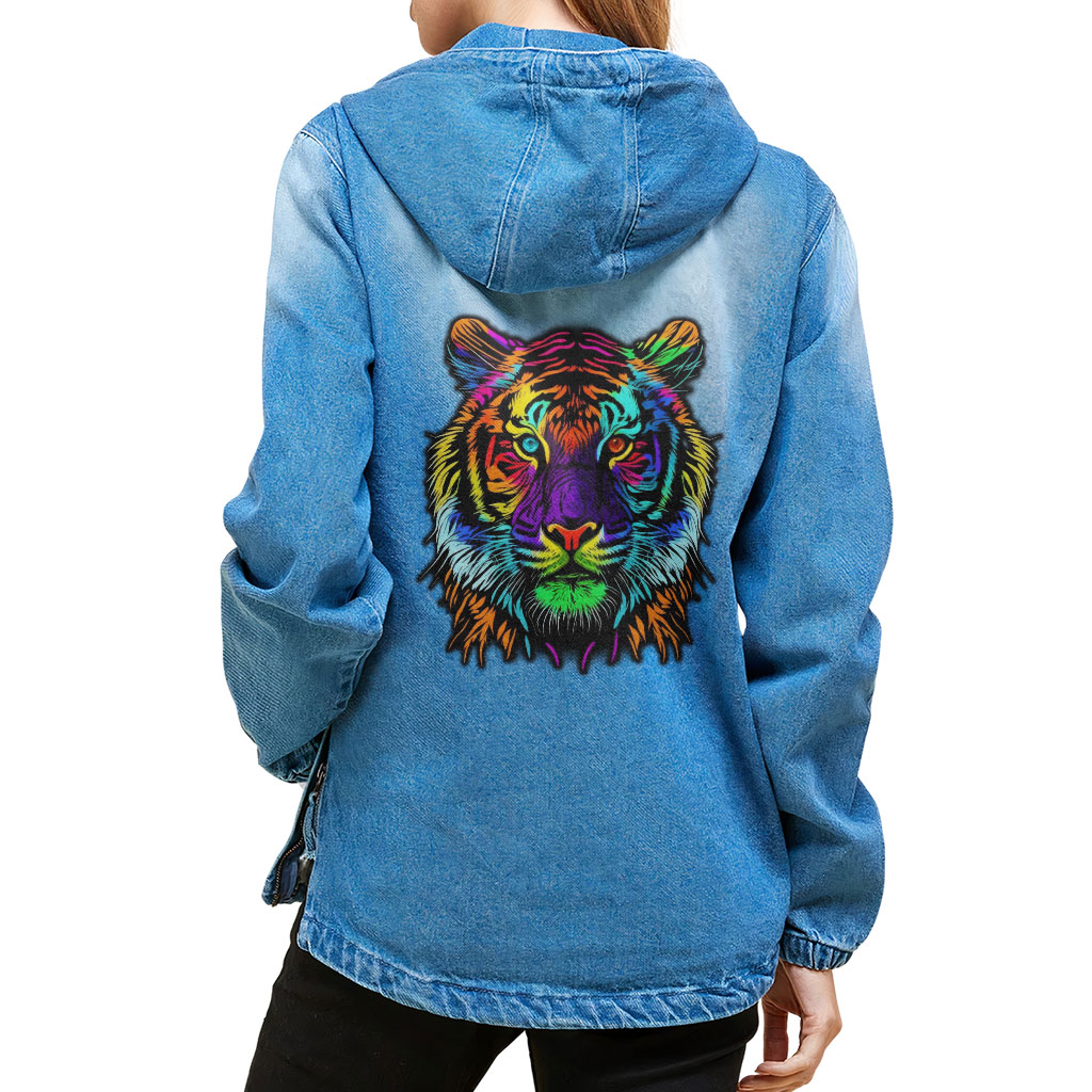 Colorful Tiger Women’s Denim Jacket with Hoodie – Gifts for Women – Tiger Themed Gifts