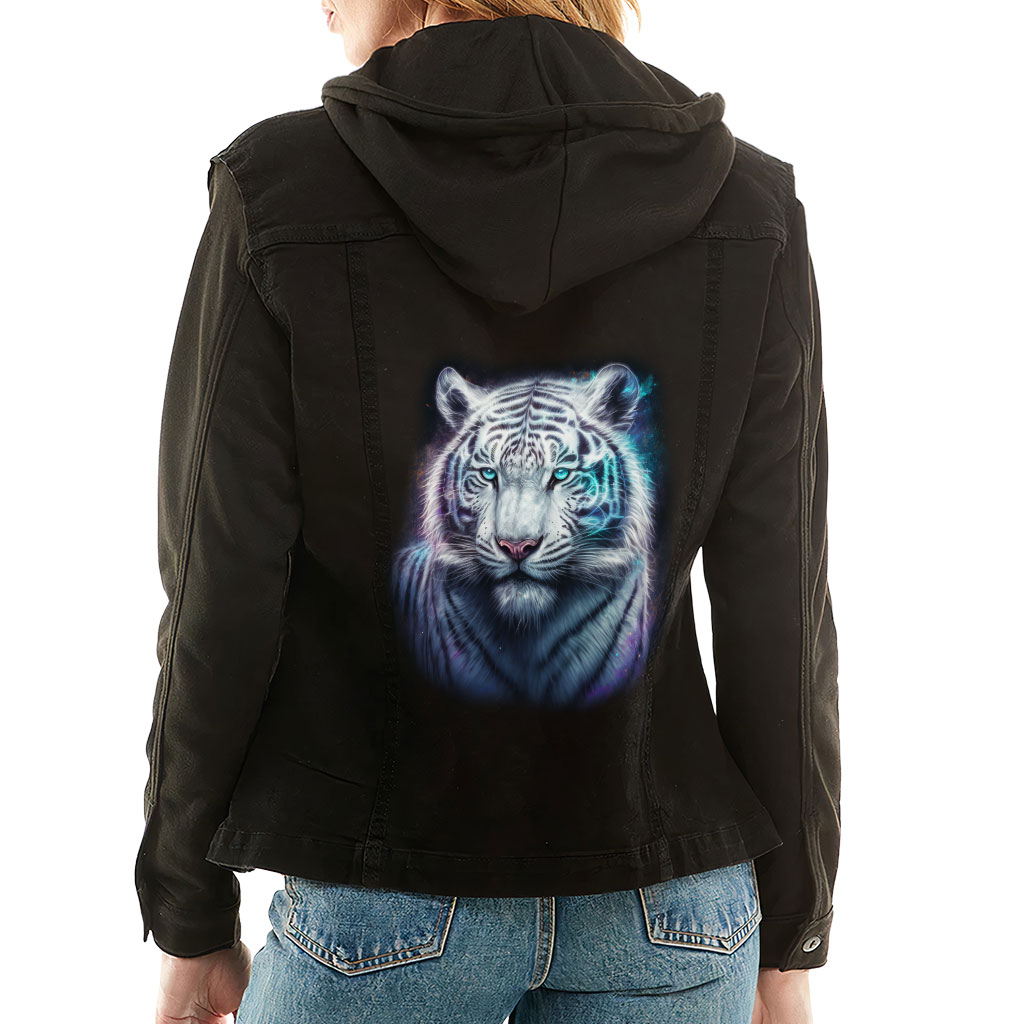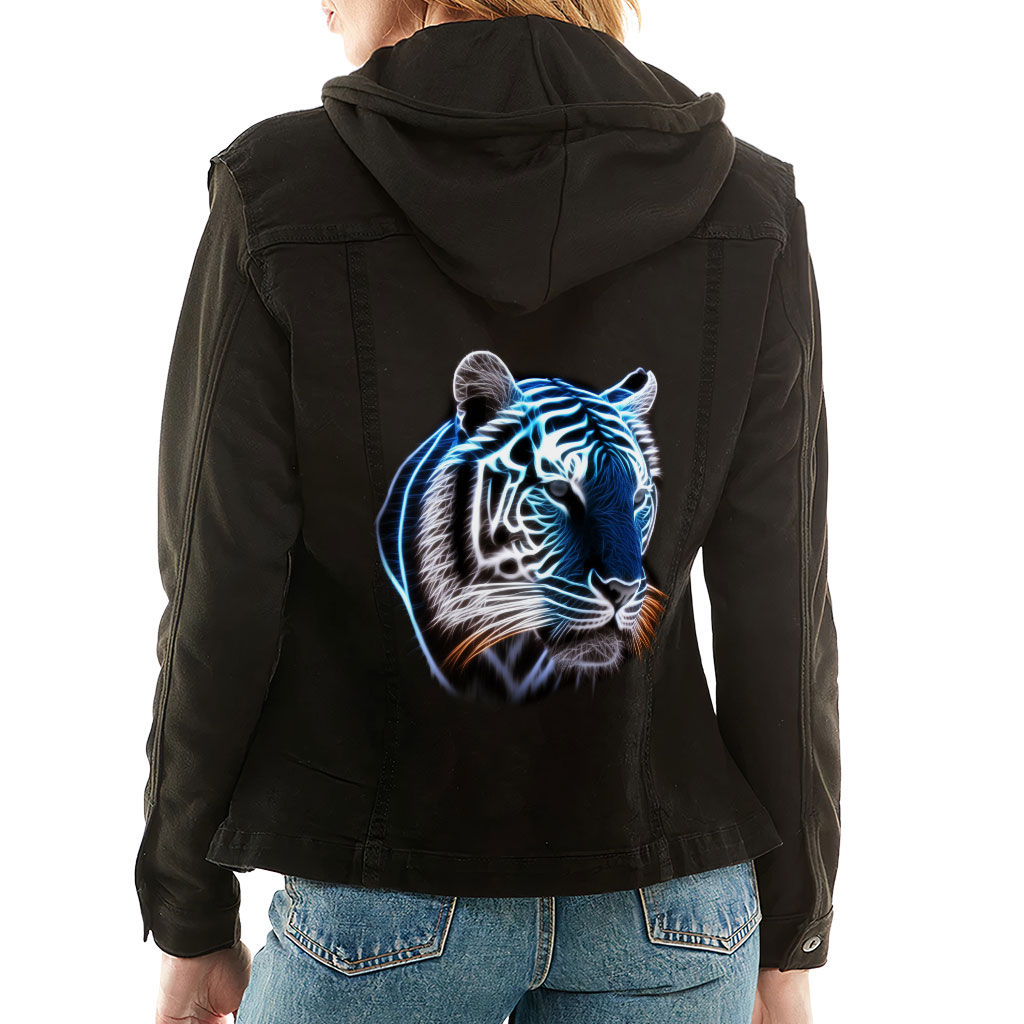Cool Tiger Ladies’ Denim Jacket with Fleece Hoodie – Gifts for Animal Lovers – Gifts for Women