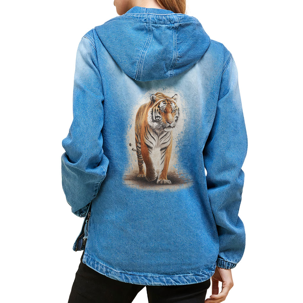 Tiger Print Women’s Denim Jacket with Hoodie – Unique Gifts – Gifts for Wildlife Lovers