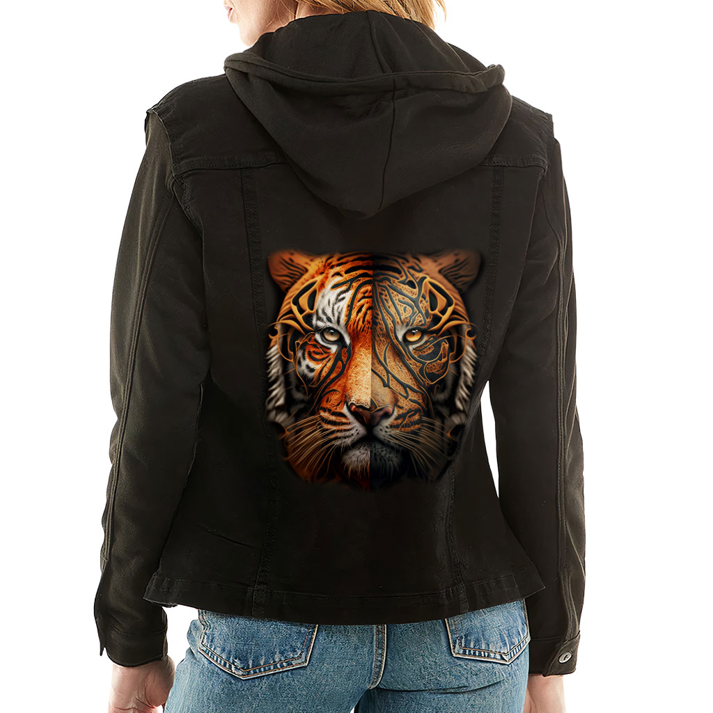 Tiger Face Art Ladies’ Denim Jacket with Fleece Hoodie – Great Gifts – Tiger Themed Gifts