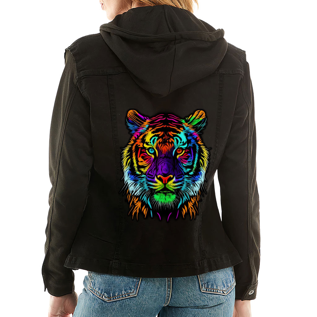 Neon Tiger Women’s Denim Jacket with Hoodie – Tiger Gifts – Gifts for Tiger Lovers