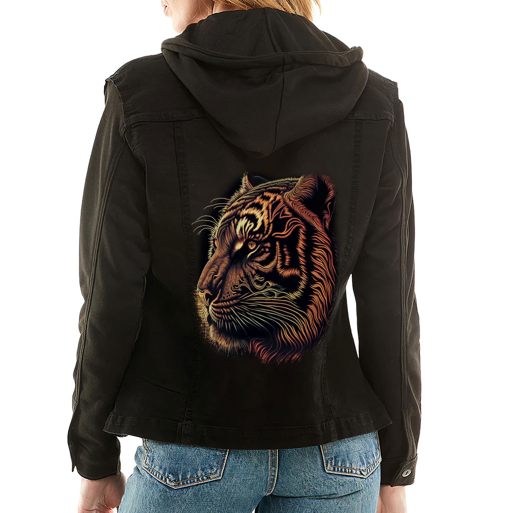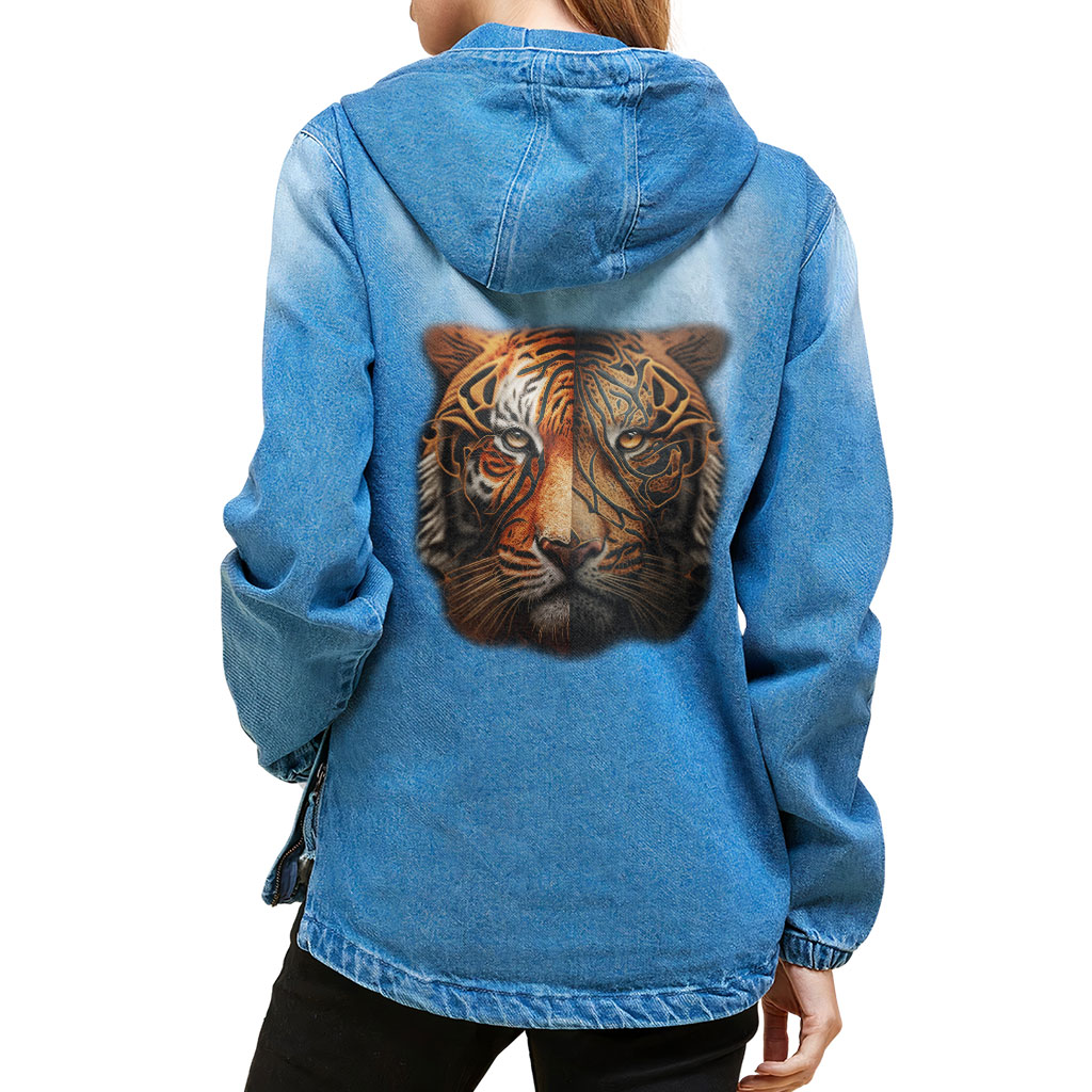Tiger Face Art Women’s Denim Jacket with Hoodie – Tiger Themed Gifts – Great Gifts