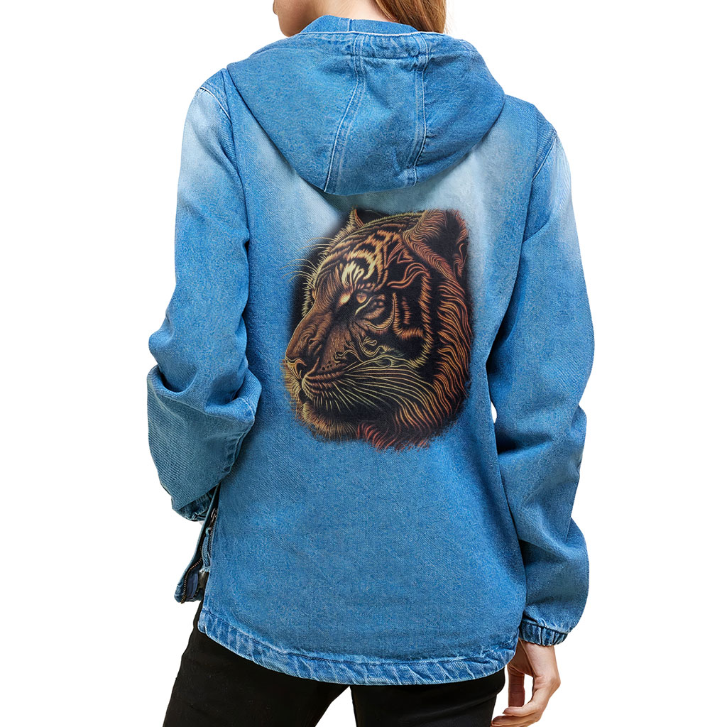 Tiger Head Women’s Denim Jacket with Hoodie – Tiger Lover Gifts – Gifts for Animal Lovers