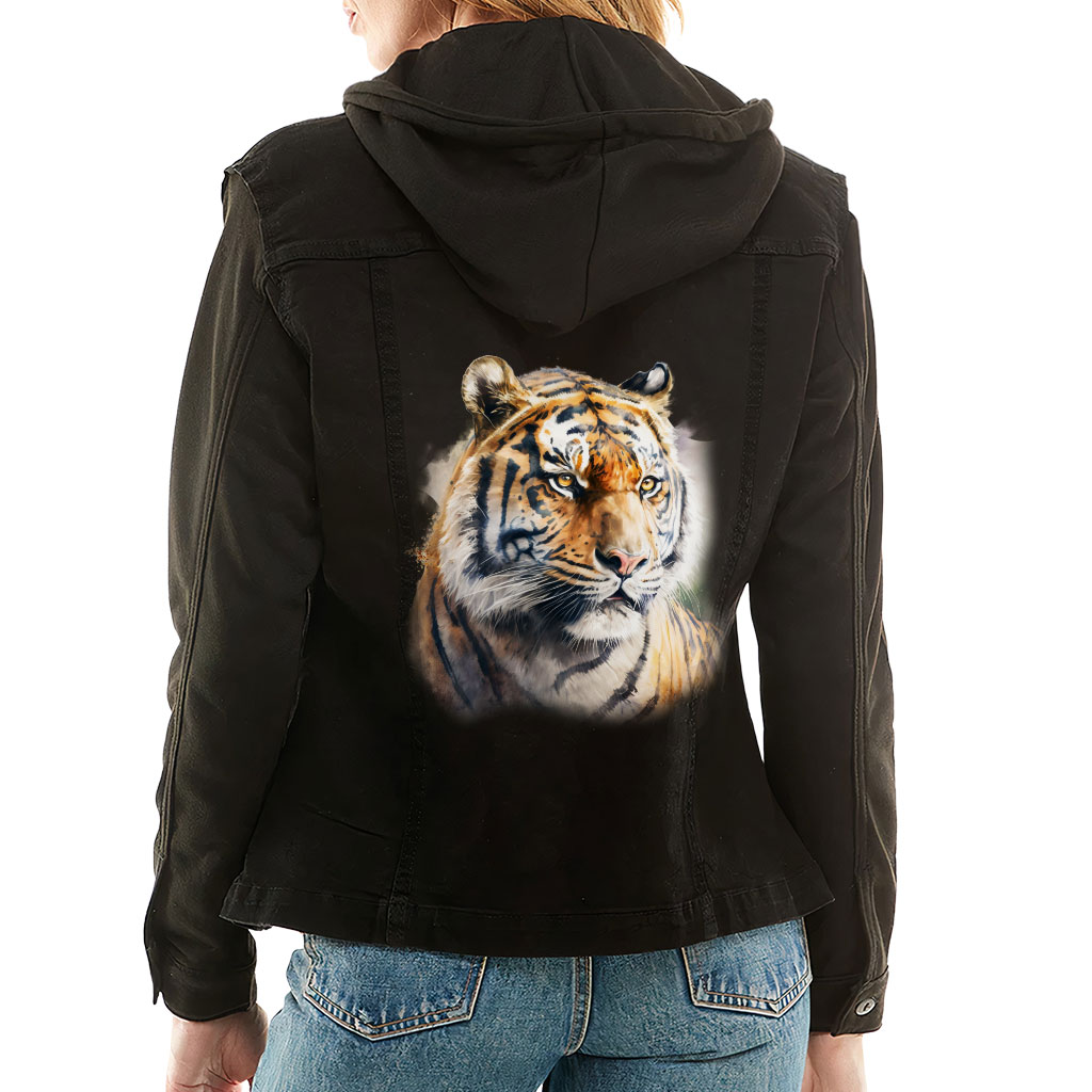 Tiger Head Watercolor Women’s Denim Jacket with Hoodie – Great Gifts – Gifts for Wildlife Lovers