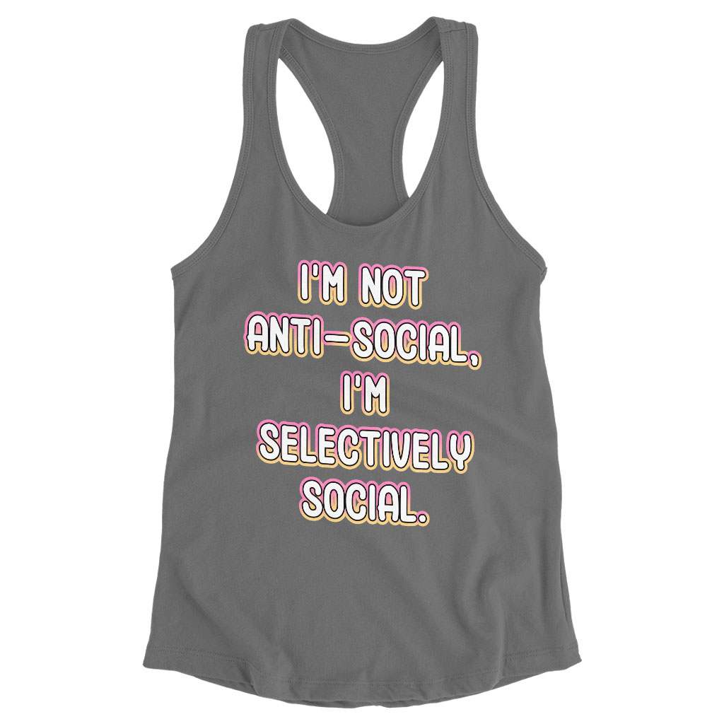 I’m Not Anti-social Racerback Tank is no ordinary piece of clothing. Its side-seamed detail and flatlock-finished hems provide a retail fit for clothing that’s true to size.
