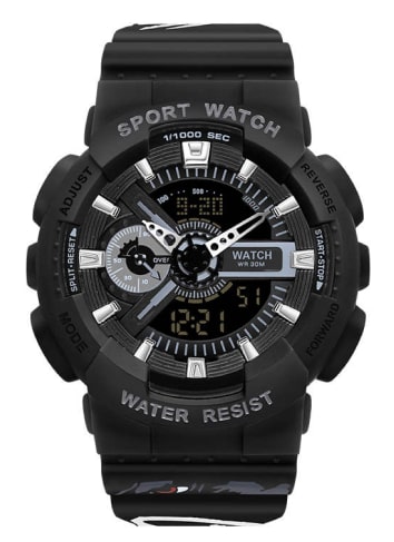 This is a men’s black sporty watch that fits your daily needs and outfits with multiple functions such as an alarm, a world timer, and day/date/month features.