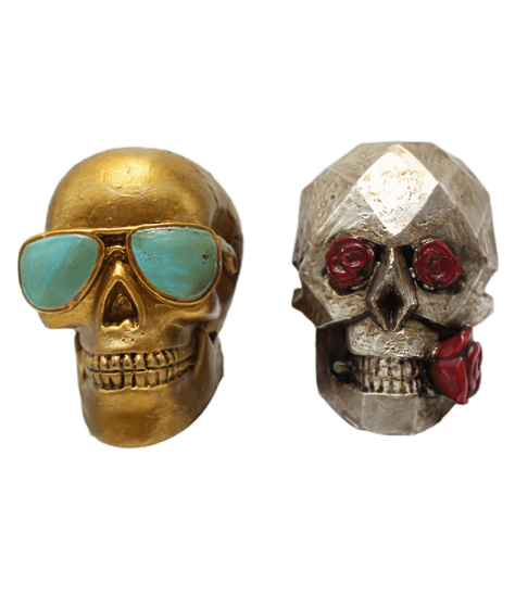 One skull is gold with cool aviator shades on, while the other is silver with rose eyes. Solid rubber construction ensures long-term use.