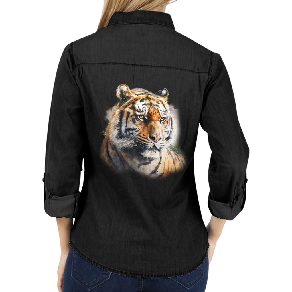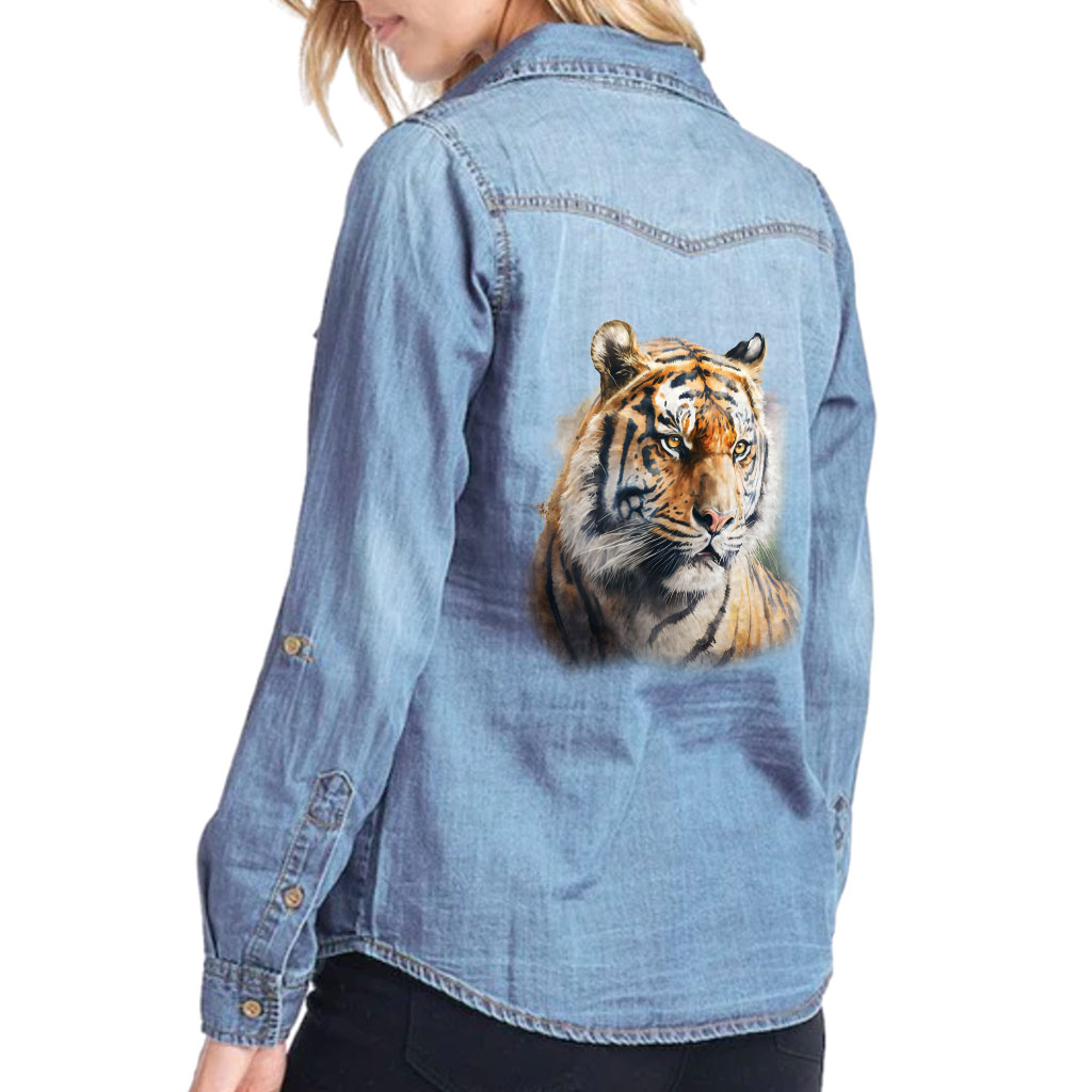 Tiger Head Watercolor Women’s Long Sleeve Denim Shirt – Gifts for Wildlife Lovers – Great Gifts
