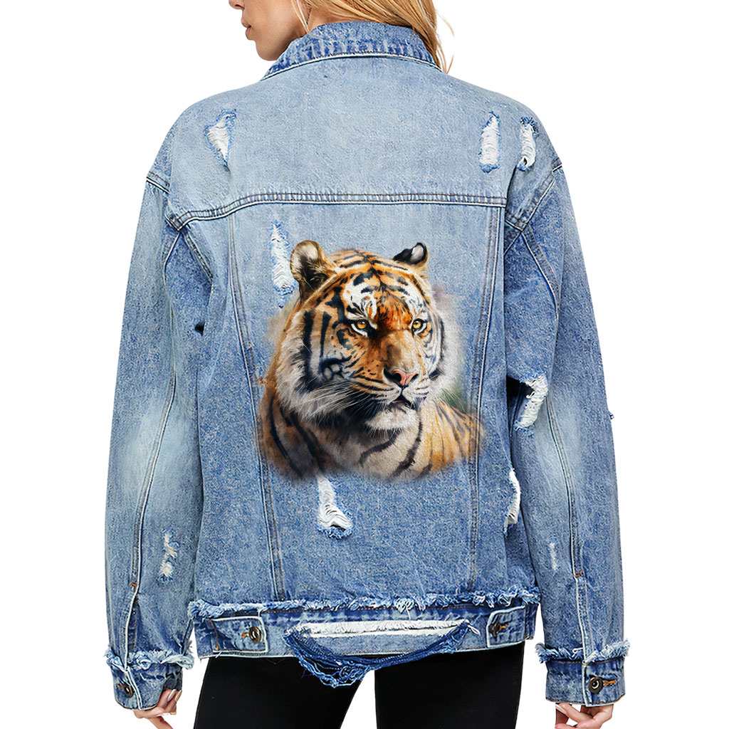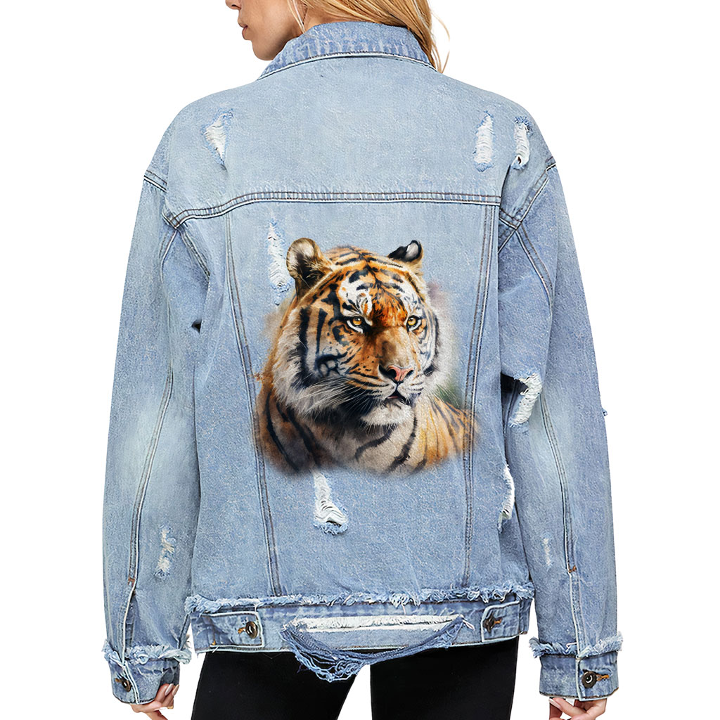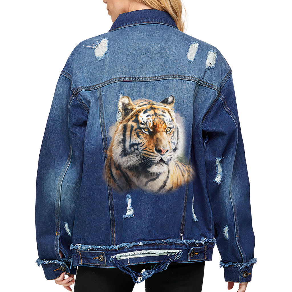 Tiger Head Watercolor Women’s Oversized Denim Jacket