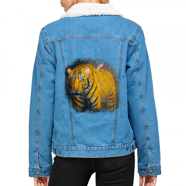 Tiger Portrait Ladies’ Denim Jacket with Fleece Hoodie is made of high-quality materials, can make people feel very warm, and features four portable pockets and a button, the drawstring hood can be adjusted according to your preferences to fit your body.
